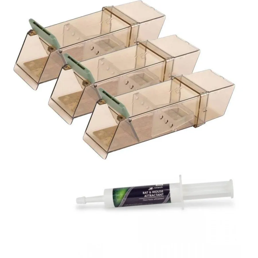 Inhoud:Â 3 Pest Stop Trip Traps + 30 gram Rotech lokmiddel voor muizen en ratten