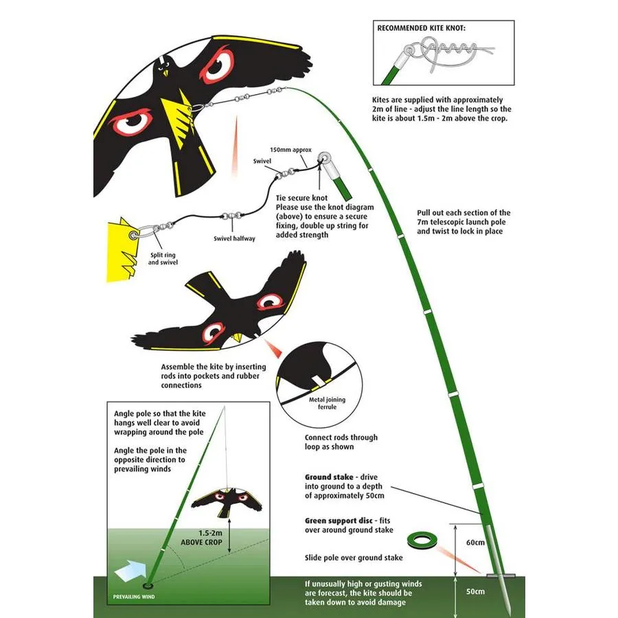 In dit pakket ontvangt u de Terror Hawk, Terror Kite en een 7 meter lange paal + grondanker. Deze vogelverjagers bewegen in de wind als echte roofvogels en zullen, in combinatie met de afschrikwekkende kleuren en ogen, de vogels op een groot gebied verjagen. Ganzen, meeuwen, kraaien, kauwen en meer. Ze worden allemaal verjaagd!